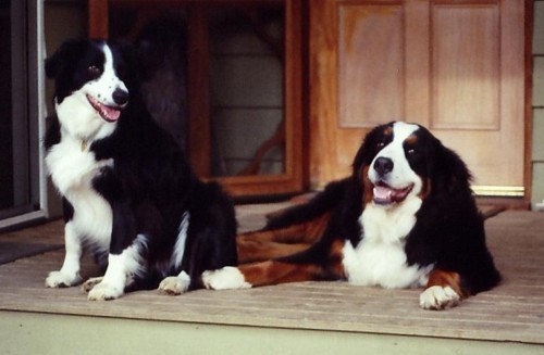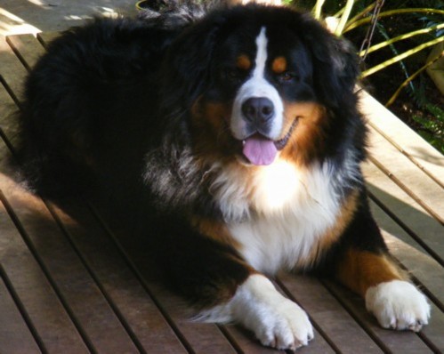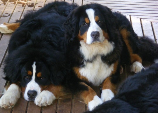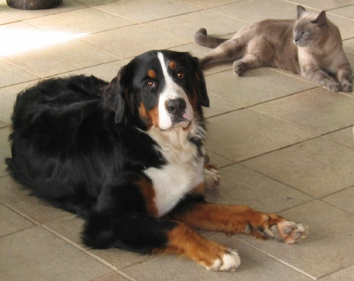 Dylan ' & ' Katie' on the shady deck ♣' Panda' & ' Katie ' by the lake ♣ Dylan '& ' Toby ' resting ♣ 'Tara' Bernese with Burmese cat